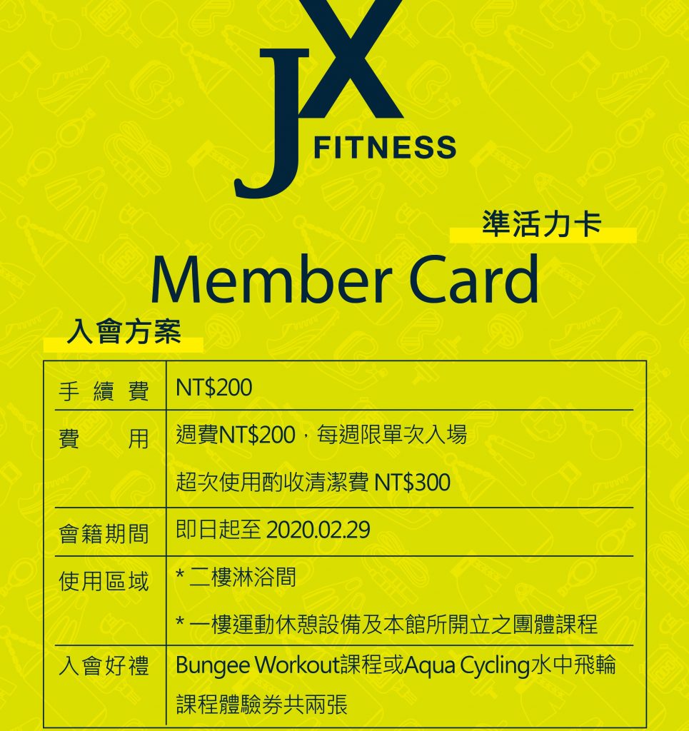 新光卡友即日起加入新光傑仕堡健身俱樂部獨享好禮!完成會員登入,點選購買準活力卡,每週會員費用200元,送等值體驗課程並加碼送Bungee Workout價值1600元及Aqua Cycling 水中飛輪價值800元兩項專業課程!